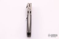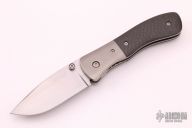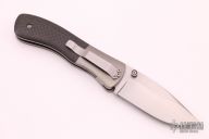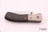 This small Model 2 linerlock folder by Mike Obenauf features a hand rub satin finished drop point blade with notched thumbrest and dual thumbstuds. The handle has bead blast finished titanium bolsters and liners, carbon fiber scales and black backspacer and a tip down stainless steel clip. Smooth action. Nice detent, blade seating and lockup. Excellent condition. Comes with zippered case.