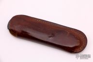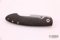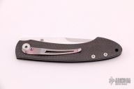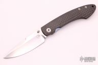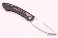 This T12 CF Linerlock Folder by William Henry Fine Knives has a hand rub satin finished spear point blade with false top edge and single thumb stud. Handle is carbon fiber with anodized titanium single liner (lock), barrel spacers, lanyard hole, and anodized titanium tip down clip. Comes with a leather slip sheath. Has some scratches, otherwise good condition.
