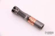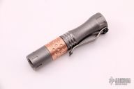 This Hoku flashlight from Mitch Lum/Laulima Metal Craft and Joshua Dawson features a titanium and copper body. 219CUK emitter.   Reflector optic.  Takes a single 10440 battery. This piece comes with a custom pouch and original info card, dated 10/13/21. DOES NOT INCLUDE BATTERY. New from maker.