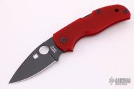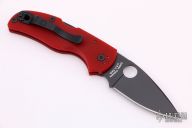 This Native 5 by Spyderco has a plain edged black blade and red G-10 handle with black stainless clip, 4-way reversible. Includes original box and papers. Excellent condition.