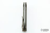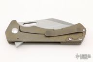 This Mastodon 3.5" Flipper by Michael Shiffer features a tumbled blade with thumbhole and flipper, fileworked thumbrest. The handle has an OD Green linen micarta scale with a natural canvas micarta pivot collar, anodized and tumble finished titanium frame, tip up clip and fileworked backspacer. Nice detent, lockup and blade seating, rides on bearings. Comes with COA dated October 9th, 2021. New from maker.