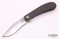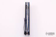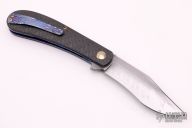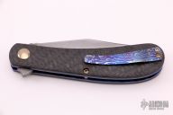 This Backpocket flipper from Doc Shiffer features a 1095 blade with beautiful hamon, fileworked thumbrest and a flipper. The handle has carbon fiber scales with bronze anodized hardware, anodized and textured titanium liners, Forged MokuTi pocket clip, tip up carry. The blade is centered when closed and locks up with no play. Rides on bearings. Comes with COA dated 10-10-21. New from maker.