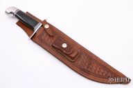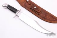 This Western Bowie by the famed maker Harvey Draper features a mirror polished blade with a nearly sharpened top edge, .300" blade stock and 2.194" blade depth, hidden tang construction. The handle has a stainless steel guard and butt with a black linen micarta grip and aluminum and black spacers. Comes with hand tooled brown leather sheath. Has some light scratches, otherwise excellent condition.