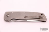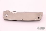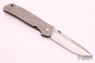 This Left Handed ATCF linerlock folder by Bob Terzuola features a spear point tumbled blade with notched thumbrest and a thumb disc. The handle has a bead blasted titanium frame and liner, black backspacer, tip up titanium clip. Nice blade seating, lockup and detent. Knife has been carried, has scuffs and scratches, otherwise good condition. Comes with original bag and card.
