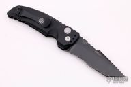 This EX-A01 by Hogue Knives is an Allen Elishewitz design, it features a black tanto partially serrated 154CM blade with notched thumbrest. The handle is black aluminum, tip up or down reversible black stainless steel clip. Has safety. Comes with Hogue box and papers. Excellent condition.