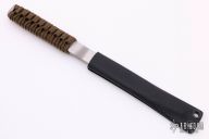 In 1988, he began making specialized knives for use by the military. This turned out to be fortunate turn of events, both for Mick and for the knife using world at large. Mick’s approach was to not get burdened by the weight of past designs. He started with a tabula rasa, a clean slate, informed only by his own experiences and knowledge of what a soldier needed in a knife. The knives he made didn’t look like the hunter-inspired knives seen in most PXs; instead they were almost brutish in their functionality: beefy, solid, and with unbreakable ¼” stock full tangs. These knives were the first indication of his innovative approach: in addition to their utilitarian design, the knives carried a subdued finish and subdued sheaths. No one carrying a Strider knife was going to be spotted because of sunlight glinting off of polished steel or a glossy leather sheath. Soldiers, policemen, and other men going into harm’s way couldn’t buy them fast enough. Mick sampled some good ideas, but made them great. For instance, he was not the first to wrap a knife handle with paracord, but he was the first to do it in a way that was tough enough for sustained infantry use. His knife line grew over the following years to include different varieties of fixed blades, all distinctive and many with specialized uses. But constant in all of them was a disregard for convention, and a desire to try new ideas. An example of this was the Ajax – it featured a very wide blade surface clearly designed to inflict damage. It drew on the weapons carried by Roman legionnaires, yet was modern and usable in the 21stCentury battlefield. Mick also worked on his technical skills, always striving to become better at the physical craft. At the 2002 Blade Show, a group of the best tactical knifemakers in the country decided to compete with each other to produce the most innovative and interesting fixed “battle blade” at the show. Mick’s entry, an incredible integral knife made out of ½” titanium stock with a zippered composite blade, gorgeous handles, and integral guard was the unanimous winner, and effectively retired the competition.