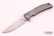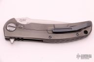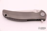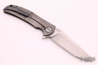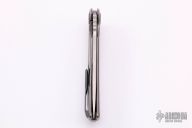 This Russian Overkill by Shirogorov and RJ Martin features a M398 blade with notched thumbrest and a flipper. The handle has a blasted and milled titanium frame, darkened titanium pivot collars, backspacer and tip up clip with hidden screws. Has RBS, nice detent, lockup and blade seating. Excellent condition. #037/200