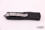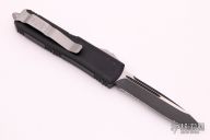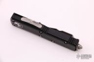 This UTX-85 by Microtech features a black partially serrated blade. The handle has a black aluminum frame with blasted hardware and tip down clip. Comes with original box and papers. Dated 03/2016 and s/n 01151. Has some light scuffs, otherwise excellent condition.