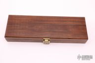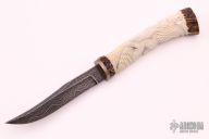 This Hunter by Wayne Hensley features a Damascus blade with false top edge, .117" blade stock and .702" blade depth, hidden tang construction. The handle has a mokume guard and a carved stag grip. Comes with a wooden display box. Excellent condition.