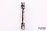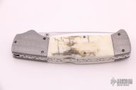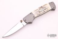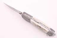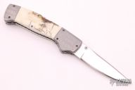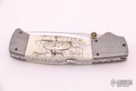 This Lockback D/A Auto by Mike Whiskers Allen features a mirror polished blade with a single citrine inlaid thumbstud and fileworked spine. The handle has dovetailed Chad Nichols "Constitution" Damascus bolsters, mammoth ivory scales, mokume push button, fileworked stainless steel liners and a fileworked stainless steel backspacer. "Whiskers 12-08" inside backspacer. Nice action, lockup and blade seating. Comes with zippered case and COA, Excellent condition.