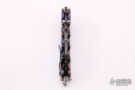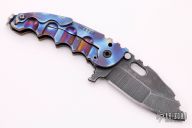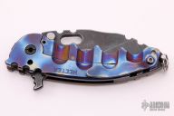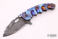 This Man of War flipper by TS Heeter features a multi ground blade with notched thumbrest, thumbhole and flipper. The handle has an anodized titanium frame with tip up reversible titanium clip, black oxide finished stainless steel backspacer. Has a pin with split ring that can be used to lock the blade open, or it can be removed to reveal a lanyard hole. Nice detent, lockup and blade seating. Has a couple light scratches, otherwise excellent condition. Includes a zippered case.