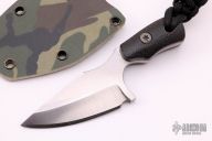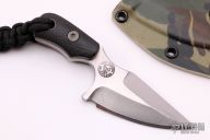 This Talon by Relentless Knives features a satin finished blade with .236" blade stock and 1.345" blade depth, full tang construction. The handle has black canvas micarta scales. Comes with a kydex neck sheath. Has some scratches on the blade, otherwise good condition.