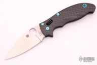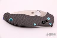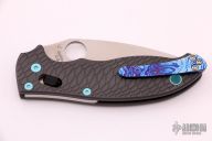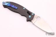 This Spyderco Manix 2 has a satin finished blade, thumbhole and notched thumbrest. The handle is comprised of custom milled and anodized scales, custom Tiffany Blue hardware and lanyard tube in pommel. Includes original box, scales and papers. Custom mokuti tip up clip. Excellent condition.
