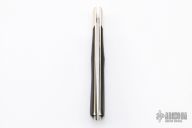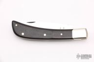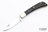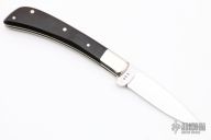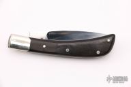 This slipjoint folder by Bill Thomason features a high polish blade with nail nick, dovetailed nickel silver bolsters, and wood scales, nickel silver liners and stainless steel spring. Half stop on blade, flush in all positions. Very nice work. This knife was made in the 70-80s. Has some light scratches otherwise excellent condition. Comes with a felt pouch.