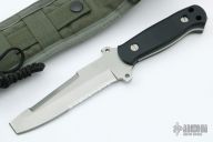 This Buck Knives model 187CP Intrepid Dive knife features a partially serrated, chisel tip blade with sharpened top edge, full tang construction and thickness of .175" and depth of 1.332". Black G10 scales.. Knife comes with a kydex sheath with nylon belt loop. Has a couple light scratches, otherwise excellent condition.