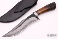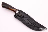 Another absolutely stunning piece from the Sobral brothers! This Condor features a San Mai Damascus blade with false top edge, .276" blade stock and 1.765" blade depth, hidden tang construction. The handle has a Aisi 420 stainless steel guard and a beautiful stag grip with nickel silver and canvas micarta spacers. This piece comes in an equally impressive, hand tooled, brown leather sheath and a leather zippered case. Excellent condition.
