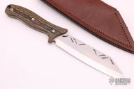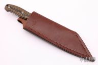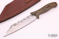 This Custom Seax Fixed Blade by Ernie Emerson features hand ground by hand satin finished blade with stonewashed flats and notched thumbrest, .136" blade stock and 1.438" blade depth, full tang construction. The handle has black/brown richlite scales. Comes with a brown leather sheath. From the 2021 Blade Show. 1 of 3 Excellent condition.