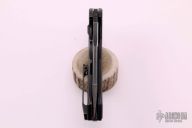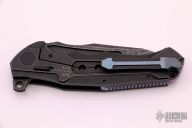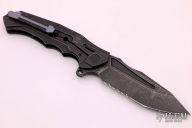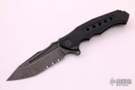 This Ronin Hybrid by Andre De Villiers features a black stonewashed partially serrated blade with notched thumbrest and flipper. The handle has a milled black G-10 and black titanium frame with tip up clip with hidden screws. Has a safety to lock the knife in the open position. Has stainless lockface insert. Rides on bearings, nice detent, lockup and blade seating. Comes with zippered case. Excellent condition.