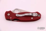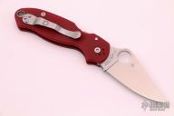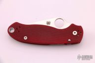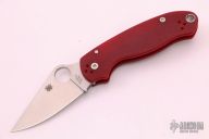 This Para 3 by Spyderco features a satin finished clip point blade with thumb hole and notched thumbrest. The handle has red G-10 scales over nested steel liners and stand-offs. The steel pocket clip is 4 way adjustable. Includes original box and papers. Excellent condition. DLT Trading Exclusive.