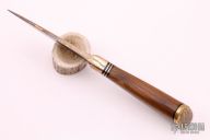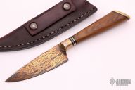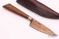 This Integral Hunter by Ariel Elias Salaverria features a San Mai Damascus blade that is clad in mokume with an 01 Tool Steel core, .236" blade stock infront of the guard and 1.333" blade depth, hidden tang construction. The handle has a Guayubira wood grip with mokume butt and black spacers. Comes with a brown leather sheath. Excellent condition. Very cool piece.