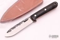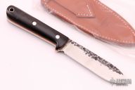 This Kephart by Lon Humphrey features a hand forged blade with satin finished grinds and forged finished flats, .177" blade stock and 1.105" blade depth, full tang construction. The handle has black canvas micarta scales with orange G-10 liners and steel pins and lanyard tube. Comes with a brown leather sheath and original box. Excellent condition.