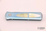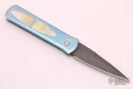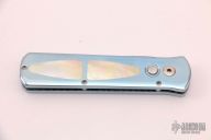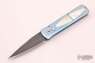 This Godson from Pro-Tech Knives features a Devin Thomas Damascus spear point blade with swedge. The handle has a polished blue anodized titanium frame with pearl inlays on the handle and the push button. Excellent Condition. Includes original box.  Excellent Condition.