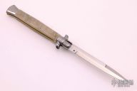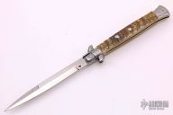 This Swivel Bolster Auto has a stainless steel spear point blade. The handle is composed of a steel front and rear bolsters, brass liners all complemented by sheep horn scales. Excellent Condition.