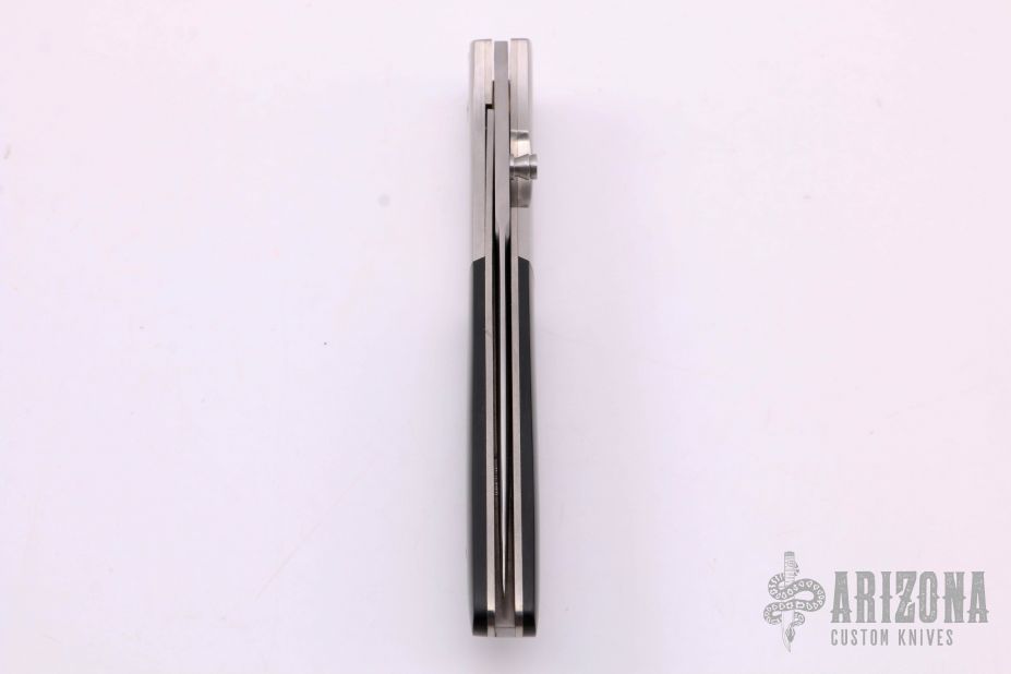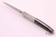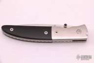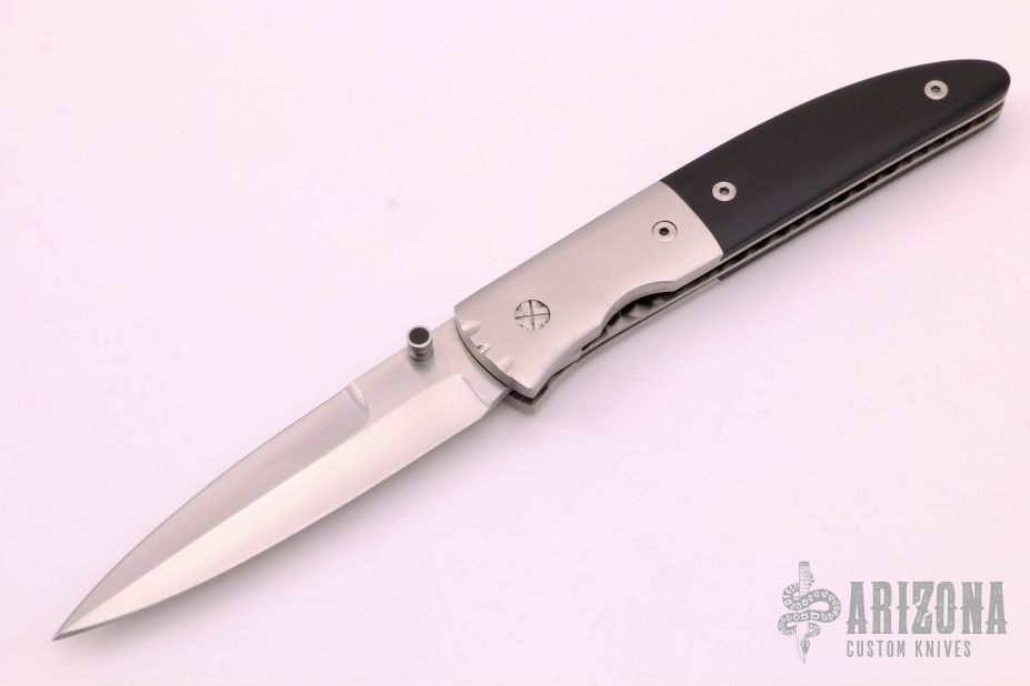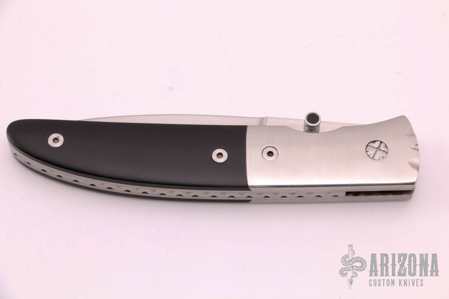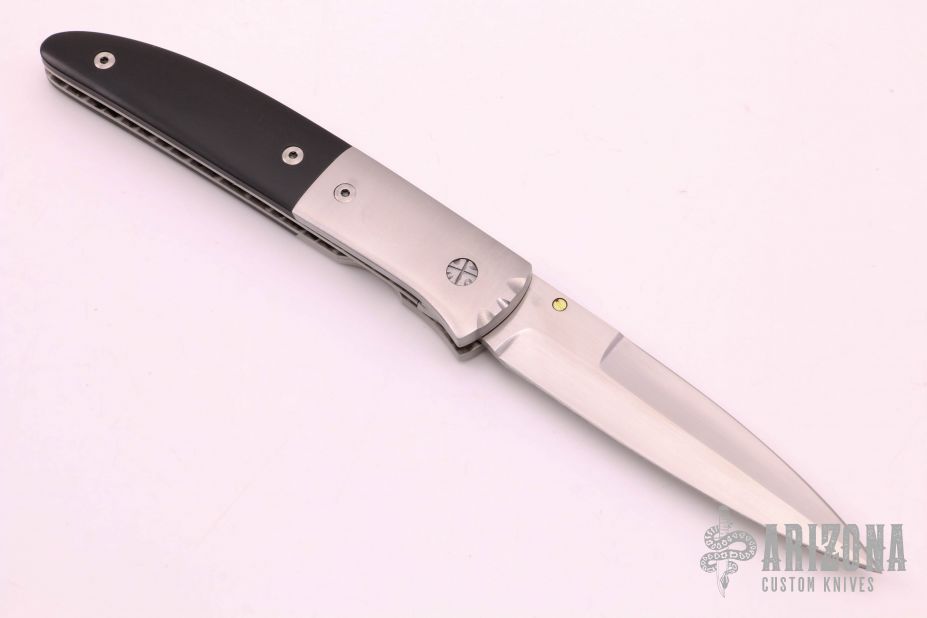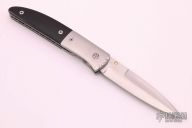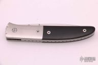 This knife by Mel Pardue features a hand rub satin finished blade with single thumbstud with inlay. The handle has dovetailed and fileworked steel bolsters and fileworked and jeweled liners and micarta scales. Has a few light scuffs, otherwise excellent condition.
