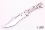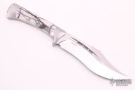 This Envoy by Javan Roberts features a hand rub satin finished blade with fullers and false top edge, .194" blade stock and 1.701" blade depth, full tang construction. The handle has satin finished 416 stainless steel bolsters and pins with stabilized mammoth ivory scales. The spine of the tang has been laser engraved. Comes with a zippered case and COA #010. New from maker.