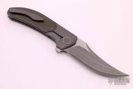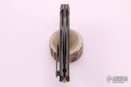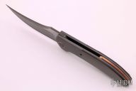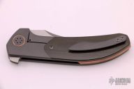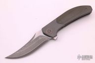 This Persian flipper by Walter Randolph features a San Mai Damascus blade with notched thumbrest and flipper. The handle has a bead blasted titanium frame with copper pivot collars, green linen micarta scales, floating copper backspacer and a bead blasted titanium tip up clip. Rides on bearings, nice detent, lockup and blade seating. Comes with cloth pouch. Excellent/new condition.