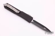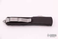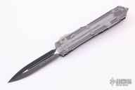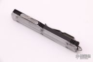 This Ultratech OTF automatic features a D/E black blade with satin finished flats and a standard edge. The handled features a clear synthetic top and an aluminum back complemented by a bead blasted stainless steel clip. Glass breaker. Serial number 84761 and dated 09/2017. Includes the original box and papers. Has some light scuffs otherwise excellent Condition.