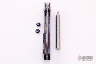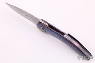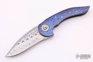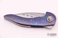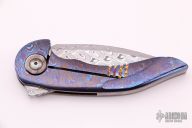 This Aesir Framelock Flipper by Glenn Are Hovin features a Damasteel blade with false top edge and flipper. The handle has mokuti frame with black lip pearl pivot collars and pivot screws, tip up mokuti clip with hidden screws, Damasteel backspacer. This knife's only hardware visible is the pivot, every other screw on the knife is hidden, pretty impressive and clean. Comes with an extra set of Mokuti pivot screws. Nice detent, lockup and blade seating. Comes with zippered case. Excellent/new condition.