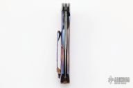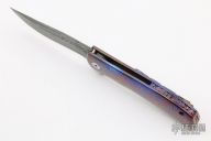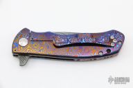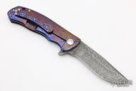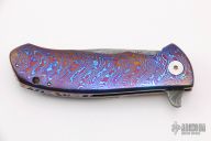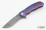 This Torrent 3.5 Framelock Flipper by DB Fraley features a Chad Nichols Boomerang Damascus blade with flipper. The handle has a full mokuti frame, has mokuti lost skulls carved tip up clip and backspacer, lanyard hole at the butt. Rides on bearings, nice detent, lockup, action and blade seating. Comes with a leather case and COA dated 12/21/20 and #18. New from maker at the 2021 Friday Night Blade Affair.