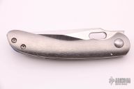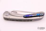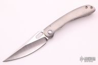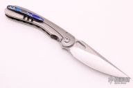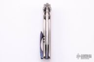 This LBV2 by Sean O'Connell features a satin finished blade with notched thumbrest and thumbhole. The handle has an orange peel and bark finished titanium frame with a Dark Ti tip up clip and backspacer. Nice detent, lockup and blade seating. Rides on bearings. Comes with a zippered case and COA dated 10-18-21. New from maker at the 2021 CCKS. Magnacut Blade Steel.