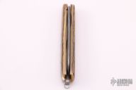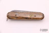 This Switch Army Switchblade by Chuck Gedraitis features a Mike Norris "Bent Lightning" Stainless Damascus blade with false top edge. The handle has mammoth ivory scales, anodized titanium liners, orange peel finished stainless steel backspacer with lanyard hole. Has tweezers and toothpick like a Swiss Army Knife. Nice action, lockup and blade seating. Comes with a zippered case and COA. New from maker at the 2021 CCKS.