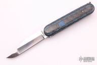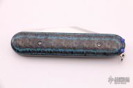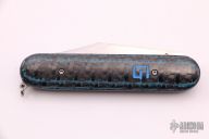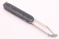 This Switch Army Switchblade by Chuck Gedraitis features a satin finished blade with false top edge. The handle has black/aqua carbon fiber scales, orange peel finished titanium liners, orange peel finished stainless steel backspacer with lanyard hole. Has tweezers and toothpick like a Swiss Army Knife. Nice action, lockup and blade seating. Comes with a zippered case and COA. New from maker at the 2021 CCKS.