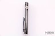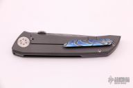This Leviathan Prototype by Walter Randolph features a Chad Nichols Intrepid Damascus blade with thumbdisc. The handle has a bead blasted titanium frame with a floating zircuti backspacer and tip up clip. Rides on bearings, nice detent, lockup and blade seating. New from maker at the 2021 Friday Night Blade Affair.