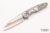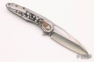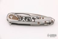 This Collaboration Sigil is by Deryk Munroe and Anthony Marfione. Features a two-tone stonewashed blade with satin flats, thumb hole and flipper, notched thumbrest. The handle has an engraved Roy Alloy stainless steel frame with 24kt gold inlays, a stainless lockbar and a titanium tip up retractable clip, titanium backspacer, copper plate and hardware, stainless lockface insert. Marked Anthony Marfione and Deryk Munroe and dated 03/2016. Excellent condition. Comes with original box, zippered case and COA.