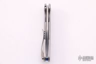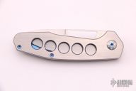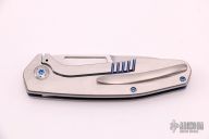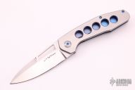 This Framelock Folder by Lee Williams features a hand rub satin finished blade with false top edge and thumbhole. The handle has a satin finished titanium frame with orange peel finished edges and blue anodized interiors, tip up orange peel finished titanium clip with hidden screws. Nice detent, lockup and blade seating, rides on bearings. Excellent Condition. Comes with a zippered case.