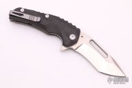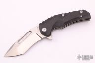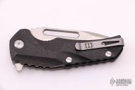 Introducing The New Reloader Flipper, A collaborative design between custom Knifemakers Jason Brous and Mikkel Willumsen. The stonewashed/acid etched D2 steel blade features a unique main hollow grind with a flat ground tanto style tip and a thick secondary swedge on each side. The Reloader utilizes an integrated flipper for quick blade deployment on a ball bearing pivot system. The handle scales are made from carbon fiber with custom milled grooves for a secure and comfortable grip. The titanium liner lock is carbidized with tungsten carbide which provides a harder lock face surface and eliminates stickiness. The knife can be deployed either with the flipper tang or manually with the groove cut out in the blade. With stainless steel hardware and a reversible, deep set, tip up pocket makes this knife a great affordable every day carry blade. Comes with original box and papers. Knife is in Excellent condition, shows no signs of use/carry.