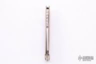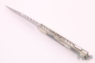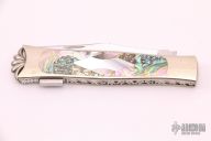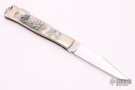 This interframe lockback folder by Ken Steigerwalt features a mirror polished clip point blade with a fileworked spine and nail nick. The handle has a nickel silver frame with pearl and abalone inlays, fileworked stainless steel backspacer. Has some scratches and a couple small patina spots on the frame, otherwise good condition.