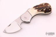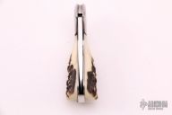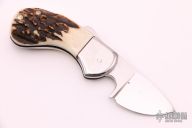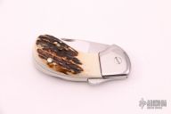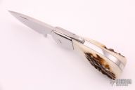 This lockback by Hoffmann (please let us know if you know this makers first name) features a mirror polished blade with nail nick. The handle has dovetailed stainless steel bolsters, stag scales with red liners, stainless steel liners and backspacer. Has some scratches and a couple small spots on the blade, otherwise good condition. #20 on blade.