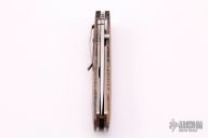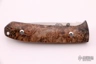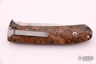 This Folding Trapper by Dozier Knives features satin finish blade with checkered thumbstud. The handle has burl wood scales, satin finished titanium liners and wood backspacer, lanyard hole at the butt, tip down stainless steel clip. Nice detent, lockup and blade seating. Excellent condition. Dated 2008