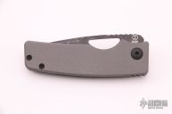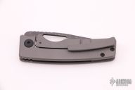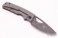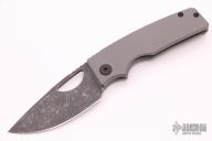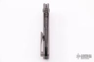 This knife by the OZ Machine Company features a acid washed Z-FiNiT blade with a false top edge, thumbhole and notched thumb rest.  The handle features a milled titanium frame with a matching titanium tip up pocket clip and backspacer.  Includes box and Papers, dated 10-06-21.  New from Maker.