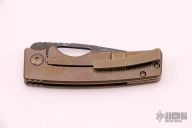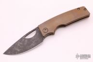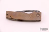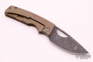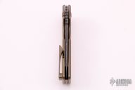 This knife by the OZ Machine Company features an acid washed Z-FiNiT blade with a false top edge, thumbhole and notched thumb rest.  The handle features a milled titanium frame with a matching titanium tip up pocket clip and backspacer.  Includes box and Papers, dated 9-22-21.  New from Maker.
