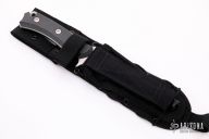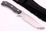 This Repercussion by Ramon Chaves features a satin finished blade with .246" blade stock and 1.579" blade depth, full tang construction with black canvas micarta scales. Comes with a black nylon sheath. From the 2021 USN Gathering. Comes with a zippered case and COA #32. Excellent condition.