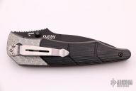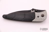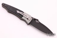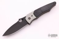 This Snody Design Gravitator folder from Benchmade features a black spear point blade with dual thumb-studs and a notched thumb-rest. The handle has silver twill bolsters and black G-10 scales, with bead blasted titanium liners and stainless steel posts. Has a stonewashed stainless steel clip. Perfect detent, lockup and blade seating. Has some light scuffs, otherwise excellent condition. Comes with original box and papers.