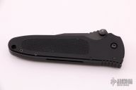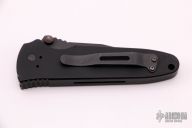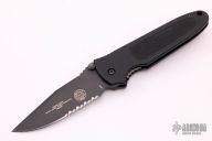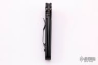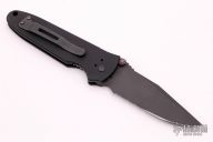 This Janich Tempest has a black partially serrated clip point blade with notched thumbrest and dual thumb\studs. Handle is black aluminum with non-slip inserts, black stainless steel reversible clip, and lanyard hole. Has some light scuffs, otherwise excellent condition.