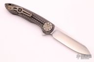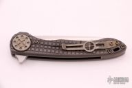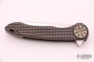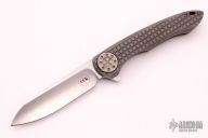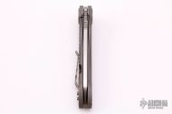 This Cruze Flipper by Curtiss knives features a satin finished blade with notched thumbrest and flipper. The handle has a bead blasted titanium frame with "FR" pattern milling, anodized and blasted titanium backspacer and tip up clip. Has stainless lockface insert, nice detent, lockup and blade seating, rides on bearings. Comes with a zippered case and COA dated 8-12-19. Has a couple light scuffs, otherwise excellent condition.