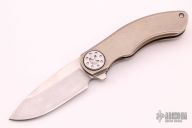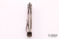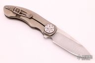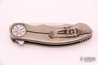 This Aero Flipper by Curtiss knives features a satin finished blade with notched thumbrest and flipper. The handle has an anodized titanium frame with matching backspacer and tip up clip. Nice detent, lockup and blade seating, rides on bearings. Comes with a zippered case and COA dated 4-23-20. Has scratches, otherwise good condition.